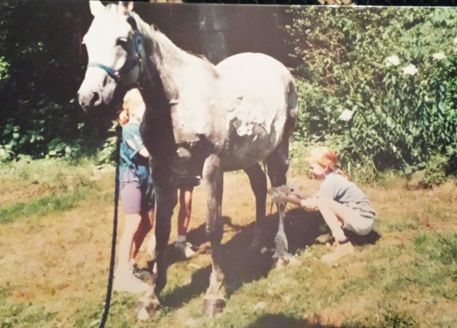 We were all introduced to the horses, introduced to the proper etiquette of how you should behave around large animals, and then took turns receiving a lessons on Demo. (I can distinctly remember having to take my index finger and waggle it at Demo's nose while saying - with emphasis - "I'm the boss, buster!") We all helped to give Demo a bath (the big grey gelding standing blissfully ground tied in the hot summer weather as the four of us lathered him up and rinsed him down) and then, the highlight of those three days, we went on a "trail ride" up Phoebe's long driveway (at least a mile one-way) riding bareback and double on Demo and their other horse Ebony.